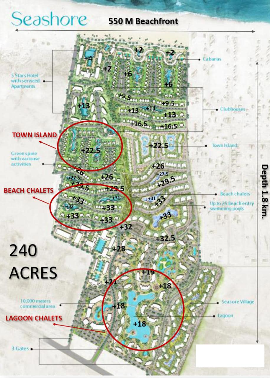 سي شور هايد بارك علي مساحة 240 فدان بتصميم فريد وبأسلوب حياة متكامل مع اطلالات خلابه علي اللاجونز والبحر بعرض شاطئ 550 متر وبخدمات عالية المستوي